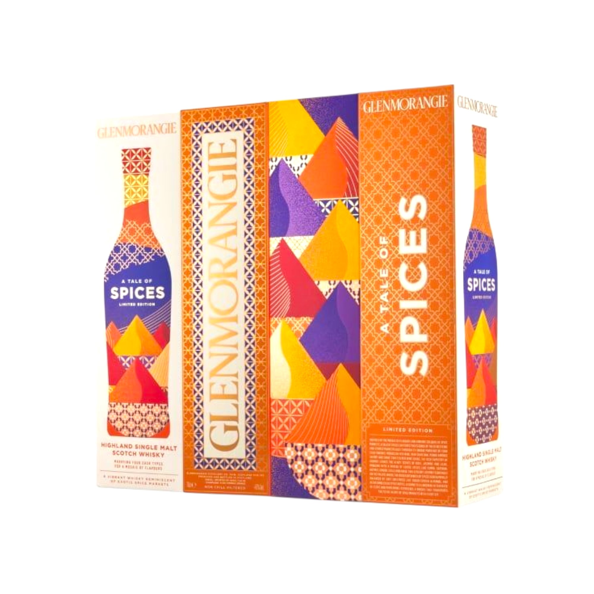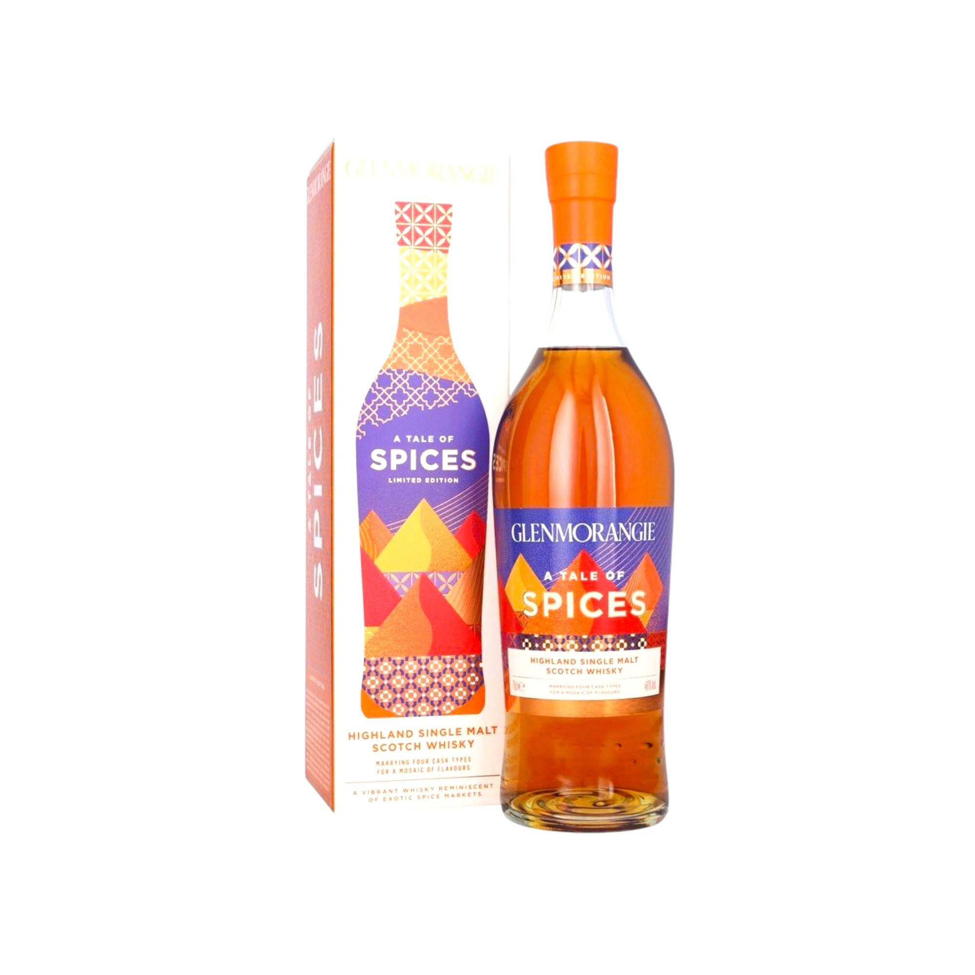 Glenmorangie A Tale of Spices is the sixth bottling in the brand’s “A Tale of…” series, inspired by the scents and colors of spice markets. It is a single malt Scotch whisky created by finishing a Glenmorangie base in four different cask types: Moroccan red wine, new charred oak, shaved toasted red wine, and Pedro Ximénez sherry. The result is a bold whisky with a perfumed, floral, and spicy profile, featuring notes of rose, jasmine, white pepper, cinnamon, nutmeg, and dried fruit.